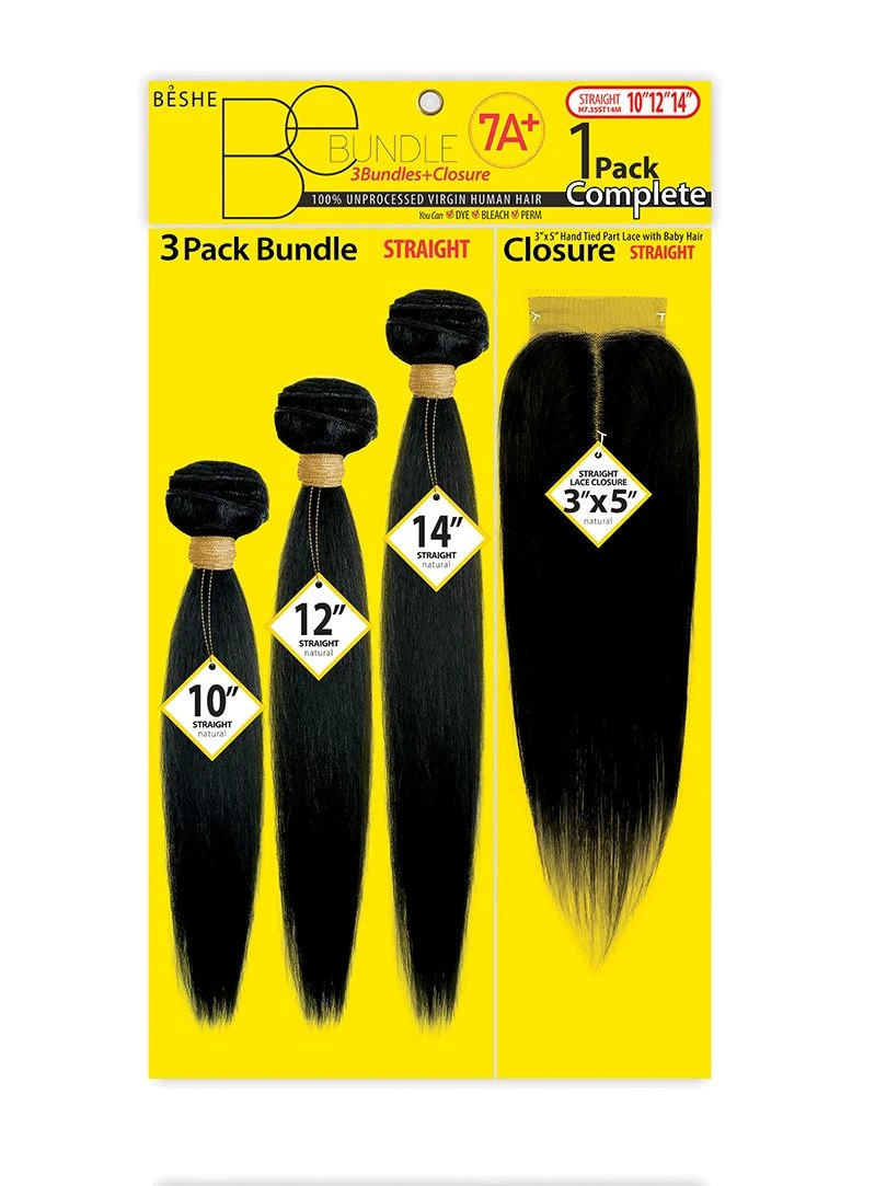 Beshe 7A+ Be Bundle Human Hair STRAIGHT Weave 3pc With 3×5 Lace Closure
